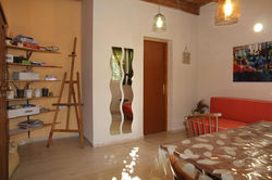 חדר קליניקה לטיפול באמנות. החלל הינו חדר בעל כניסה נפרדת בוילה בכפר נטר. בעלת הבית, תרפיסטית באמנות במקצועה החליטה לפתוח קליניקה בבית.